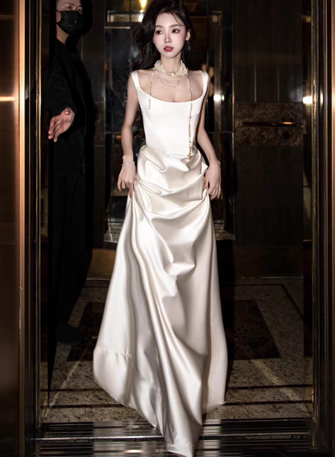 Modest Sheath Square Neck Long Evening Gowns White Satin Special Formal Dresses Prom Dresses DP2775