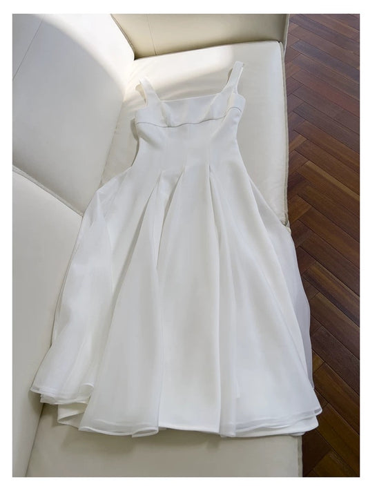 Elegant A Line Square Neck White Chiffon Sleeveless Long Evening Party Gowns Evening Formal Dresses Prom Dress DH98