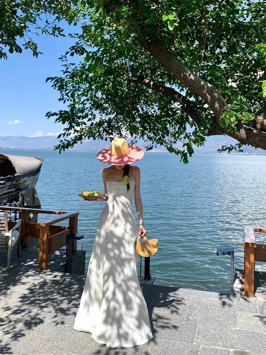 Elegant A Line Spaghetti Straps Sleeveless Lace White Long Evening Party Gowns Evening Formal Dresses Prom Dress W898
