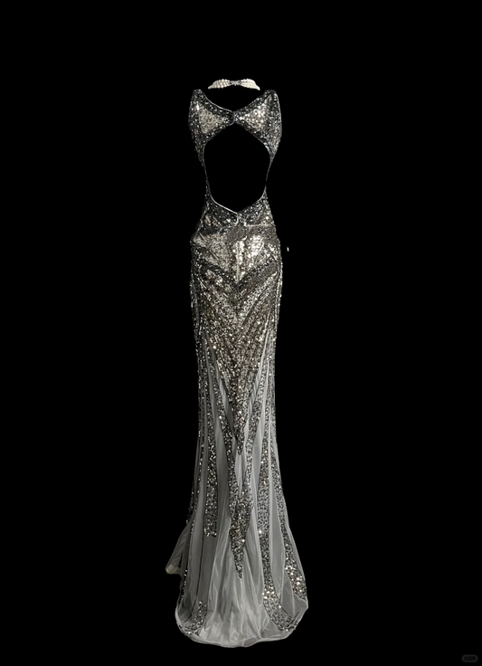Elegant Glamour Mermaid V Neck Sequin Gray Backless Long Prom Dresses Party Dress Evening Dress DP910