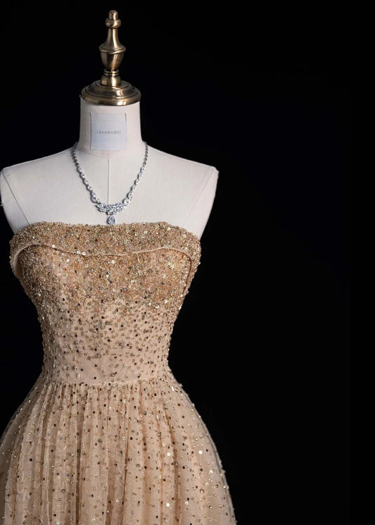 Cute Strapless A-line Long Prom Dresses Sequined Tulle Pastel Orange Evening Dresses DP3728