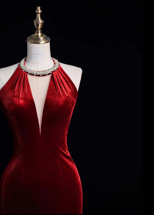 Elegant V-neck Sheath Long Prom Dresses Velvet Open Back Burgundy Evening Dresses DP3340