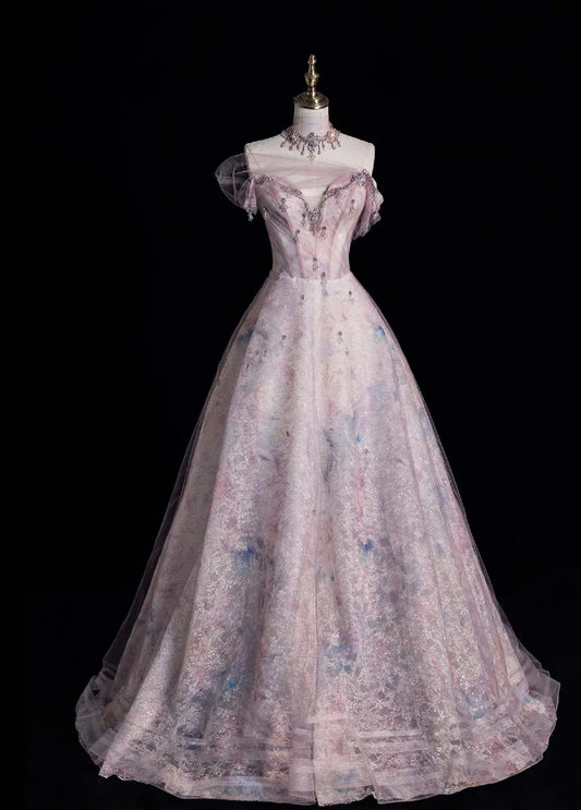 Fairy Sweetheart A-Line Long Prom Dresses Lace Tulle Pink Evening Dresses DP3341