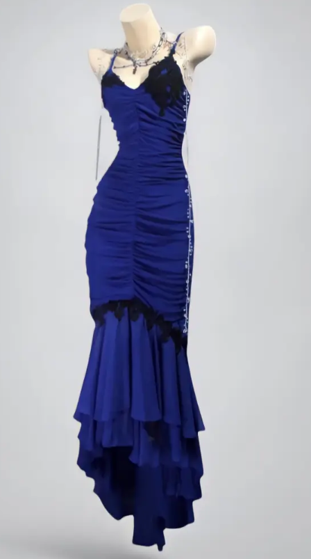 Elegant Spaghetti Strap Mermaid Long Prom Dresses Chiffon Blue Formal Dresses Sleeveless Evening Dresses DP3280