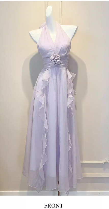 Sweet V-neck Sheath Long Evening Dresses Chiffon Ruffles Backless Party Dresses Purple Birthday Dresses DP3308