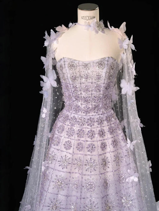 Gorgeous Strapless A-Line Long Evening Dresses Tulle Beaded Light Purple Prom Dressess DP3310