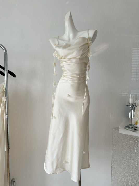 Cute A line Spaghetti Straps Champagne Floral Long Satin Summer Dress For Women DP0009