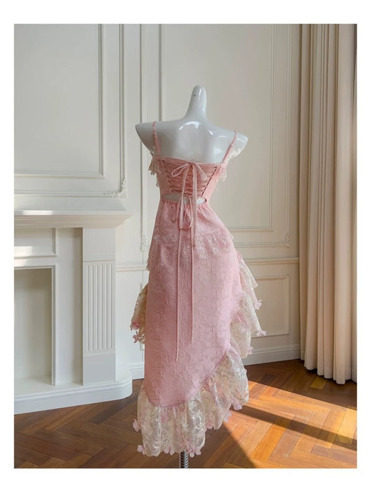Cute High Low Spaghetti Straps Pink Lace Formal 8th Grade Homecoming Dresses Summer Middle School Hoco Dress Homecoming Outfits DH104