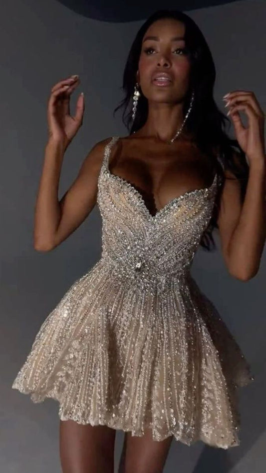 Fancy Short Hoco Dresses A line Straps Champagne Mini Formal 8th Grade Homecoming Dresses Summer Middle School Homecoming Outfits DH25
