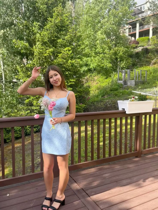 Modest Sheath Spaghetti Straps Light Sky Blue Sequin Short Mini Formal 8th Grade Homecoming Dresses Middle School Short Cocktail Gowns Graduation Dress Hoco Outfits DH2027