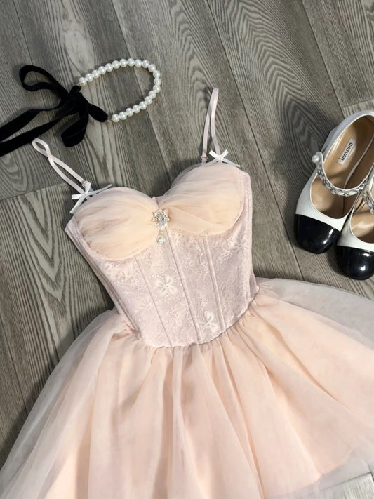Cute A Line Spaghetti Straps Pink Tulle Formal 8th Grade Homecoming Dresses Middle School Short Birthday Gowns Graduation Dress Hoco Outfits DH2088