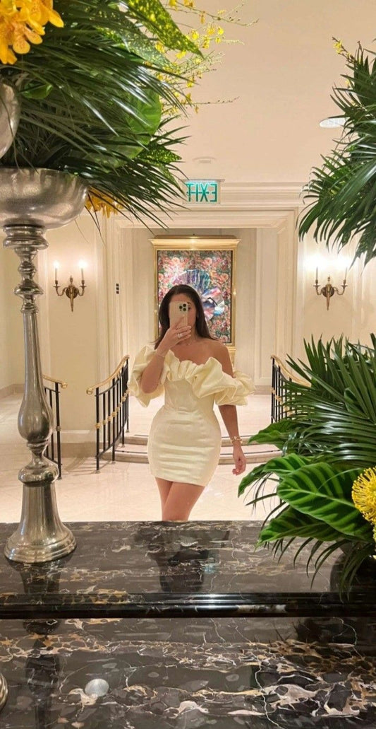Classy Sheath Off The Shoulder Ivory Short Mini Formal 8th Grade Homecoming Dresses High School Hoco Court Dress Graduation Dress Hoco Outfits DH1829