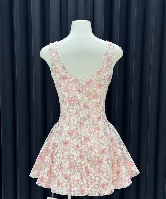 Sweet Pink A-Line Square Neck Short Homecoming Dress Floral Birthday Dress Formal Dress DP2911