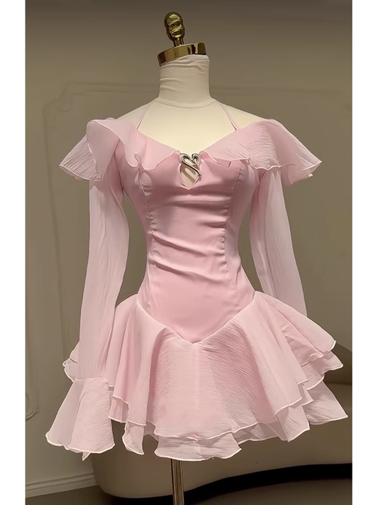 Simple A line Off The Shoulder Pink Chiffon Short Mini Homecoming Dress Summer Hoco Dresses Mini Cocktail Dress DH627