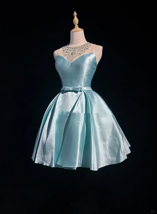 Pretty Ball Gown Scoop Neck Blue Satin Silver Beads Short Formal 8th Grade Homecoming Dresses Summer Middle School Hoco Dress 6th Grade Graduation Outfits DH527
