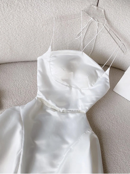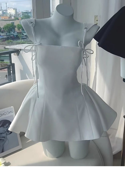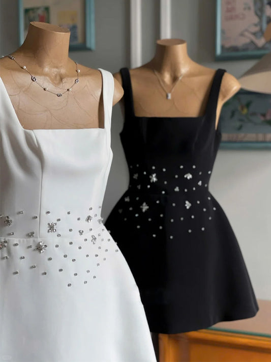 Trendy A Line Spaghetti Straps White Black Satin Mini Short Formal 8th Grade Homecoming Dresses Summer Middle School Hoco Dress Homecoming Outfits DH421