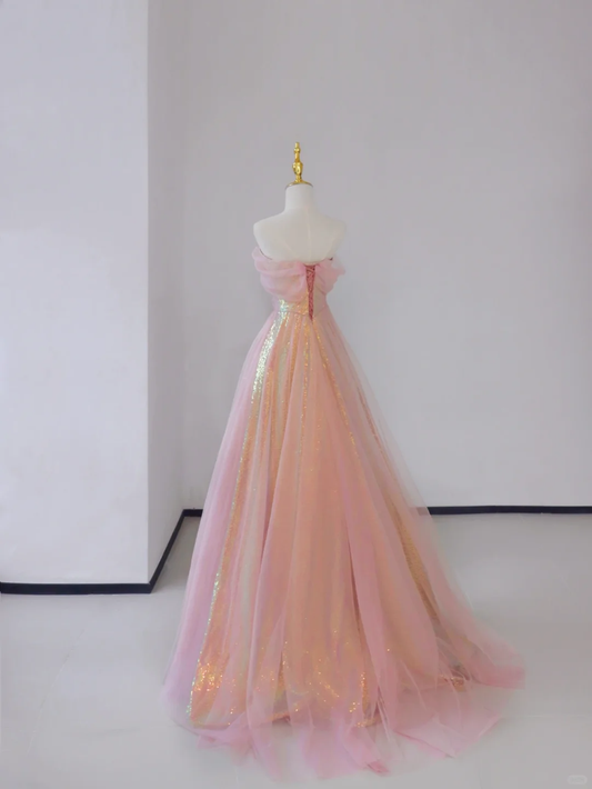 Fairy-tale A Line Off The Shoulder Pink Tulle Long Prom Dresses Evening Dresses DP501