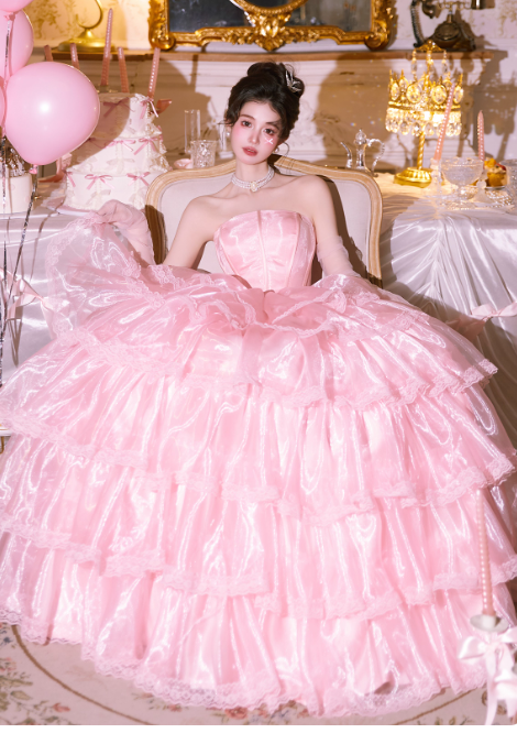Cute Strapless Ball Gown Tiered Tull Long Prom Dress, Pink Sweet 16 Dress DP3023