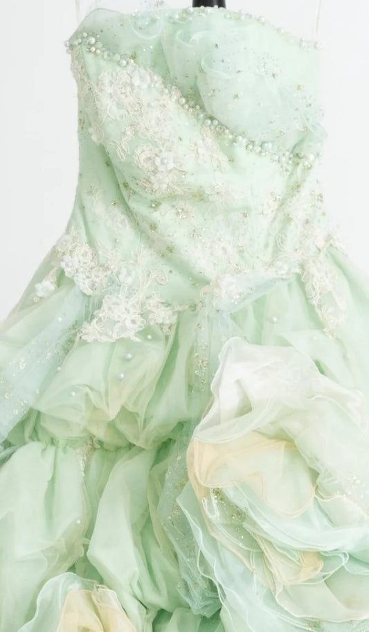 Gorgeous Strapless Ball Gown Tulle Lace Long Prom Dresses Green Quinceanera Dresses DP3012