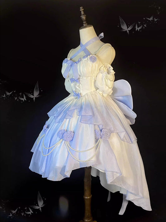 Beautiful High Low Off The Shoulder Short Sleeves Blue Rose Floral 16th Chiffon Birthday Dress Lolita Dress 18th Birthday Outfits W1223