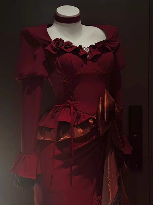 Vintage Mermaid Sweetheart Long Sleeves Burgundy Black Lace Summer 18th Birthday Dress Lolita Dress Birthday Outfits W1215
