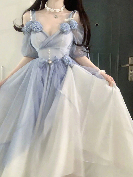 Sweet A line Sweetheart Blue Chiffon Floral Long 16th Birthday Dress Lolita Dress Birthday Outfits W1128