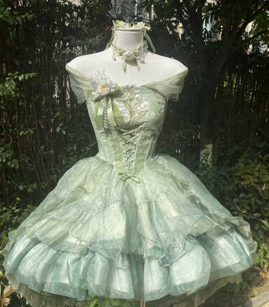 Cute Off-the-shoulder Short Ball Gown Tulle 18th Birthday Outfit Green Lolita Dresses DP3321