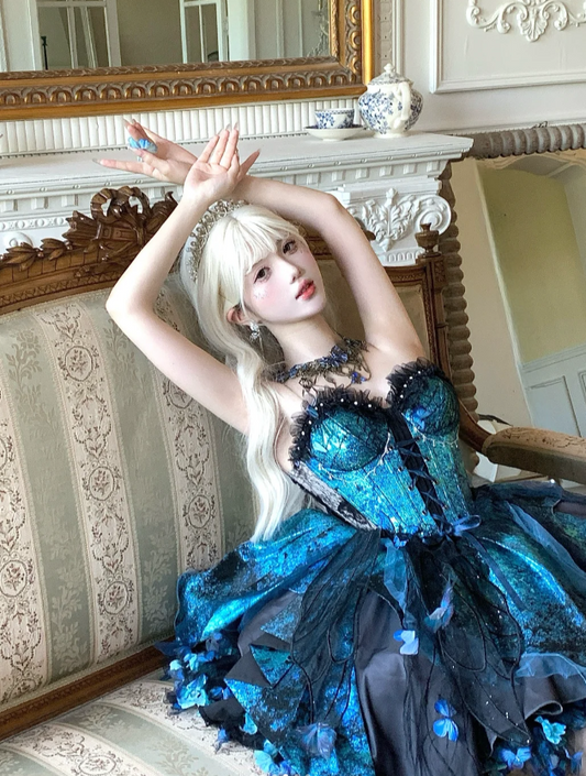 Fairy Sweetheart Neck Ball Gown Satin Applique Sleeveless Birthday Dresses Blue Lolita Dresses DP3325