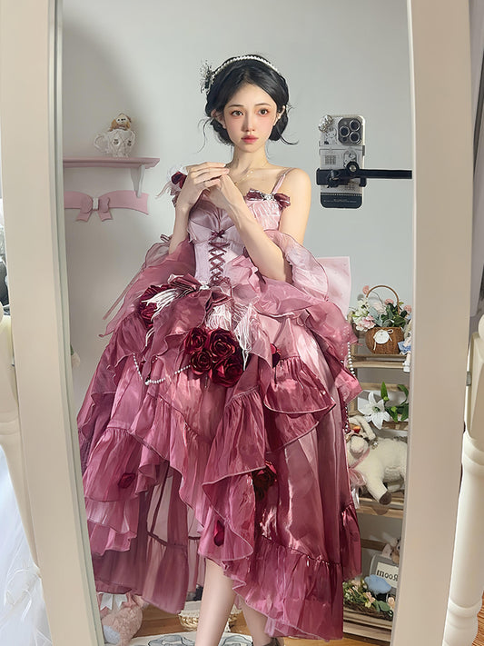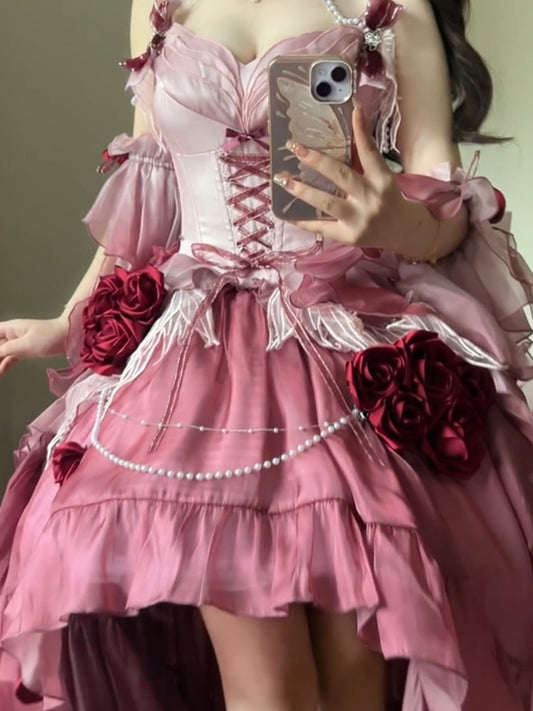 Vintage Ball Gown Spaghetti Straps Chiffon Summer 18th Birthday Dress High Low Ombre Pink Lolita Dress Birthday Outfits DH2415