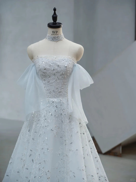 Unique Off-the-shoulder Bridal Dress with Tulle Appliques Ball Gown in Light Blue Sequin Long Wedding Dresses Luxury Floor Length Bridal Gowns DH2722
