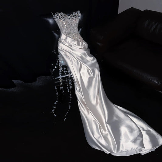 Vintage Mermaid Strapless Satin White Wedding Dress Modest Wedding Dresses Princess Wedding Gowns DH1767