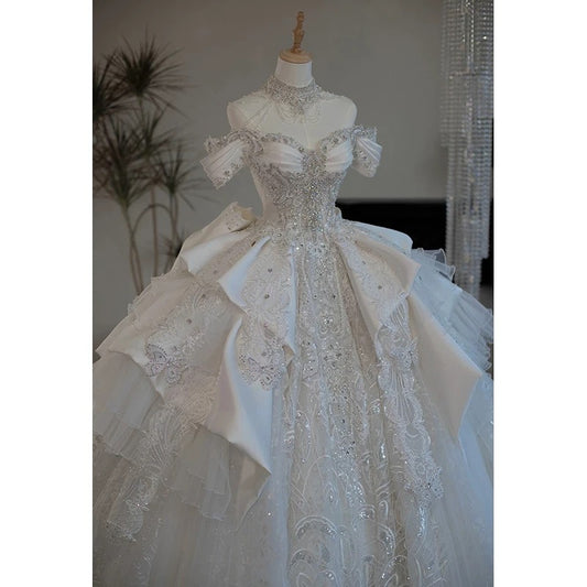 Vintage Wedding Gown Bridal Dress Ball Gown Off The Shoulder Satin Wedding Dress White Wedding Dresses Modest Wedding Gowns DH1766