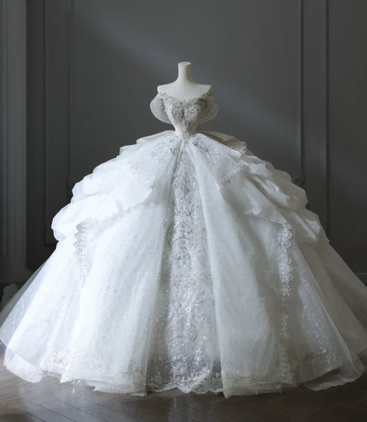 Princess Bridal Dress Ball Gown Off The Shoulder Tulle Wedding Dress With Short Sleeves Wedding Dresses Modest Wedding Gowns DH1503
