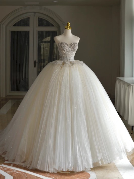 Unique Bridal Dress Ball Gown Sweetheart Silver Beads Satin White Long Wedding Dresses Luxury Bride Dress Bridal Gowns D1612