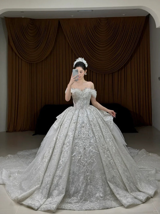 Romantic Bridal Gown Ball Gown Off The Shoulder White Lace Floor Length Wedding Dresses Minimalist Bridal Gowns WD048