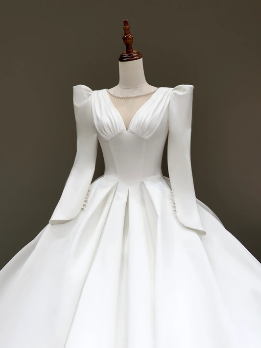 Princess Bridal Gown Ball Gown Scoop Satin White Beads Wedding Dresses With Sleeves Bridal Gowns DP823