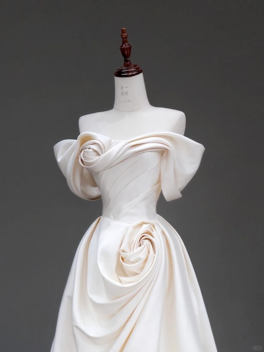 Classy Elegant A Line Off The Shoulder White Satin Long Wedding Dress Brides Dress DP644