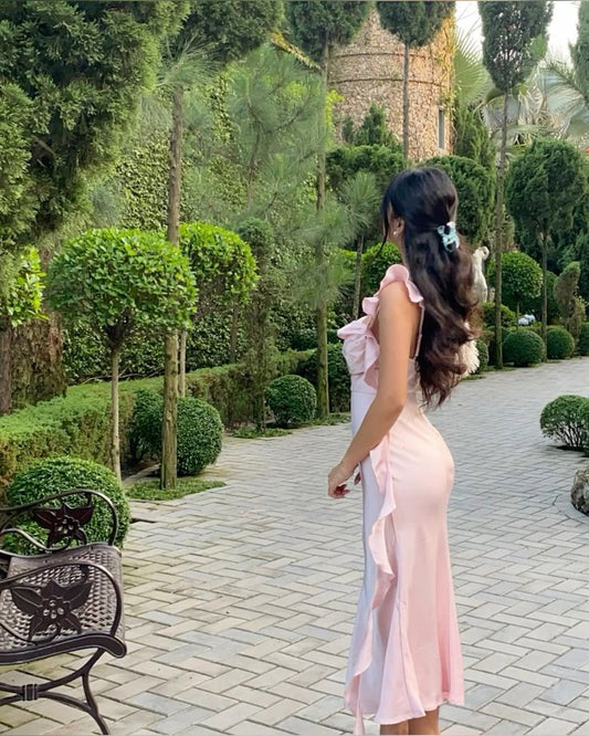 Classy Sheath Square Neck Ruffles Satin Backless Prom Gown Summer Wedding Guest Dress Bridal Guest Dresses Wedding Outfits For Guest W0689
