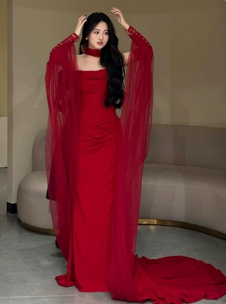 Classy Mermaid Square Red Long Prom Gown Summer Wedding Guest Dress Bridal Guest Dresses Wedding Outfits For Guest W0767