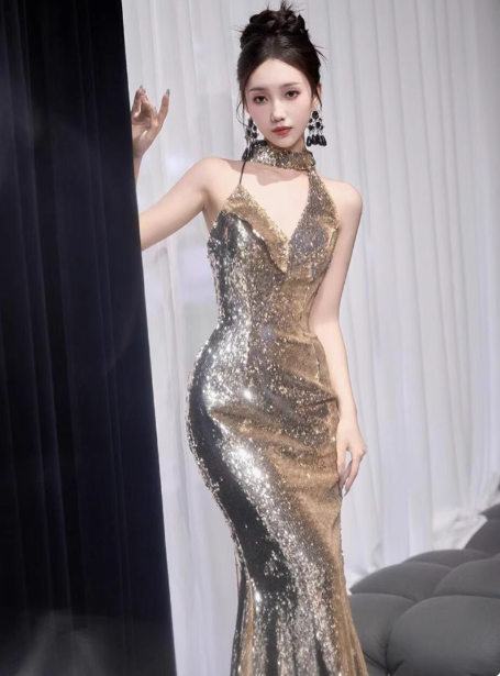 Classy Mermaid Gold Sequin Long Prom Dresses Formal Gown Summer Wedding Guest Dresses Wedding Guest Outfit W0730