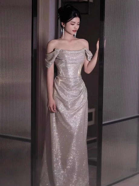 Classy Mermaid Off The Shoulder Gray Sequin Long Prom Dresses Formal Gown Summer Wedding Guest Dress Wedding Guest Attire W0381