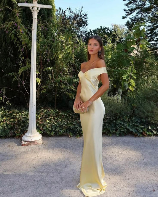 Simple Sheath Off The Shoulder Yellow Long Prom Dresses Formal Summer Wedding Guest Dresses Wedding Guest Outfit W0239