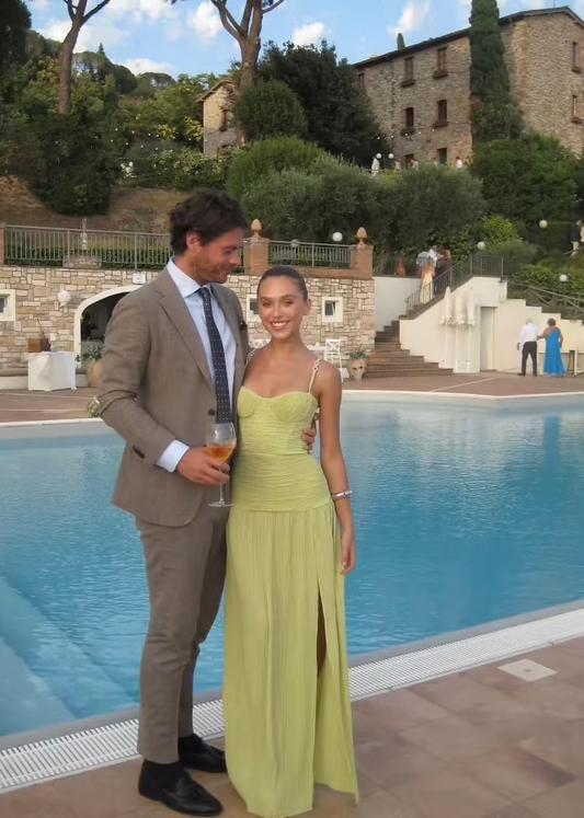 Modest A line Spaghetti Straps Green Prom Dresses Formal Summer Spring Slit Wedding Guest Dresses Wedding Guest Outfit W0179