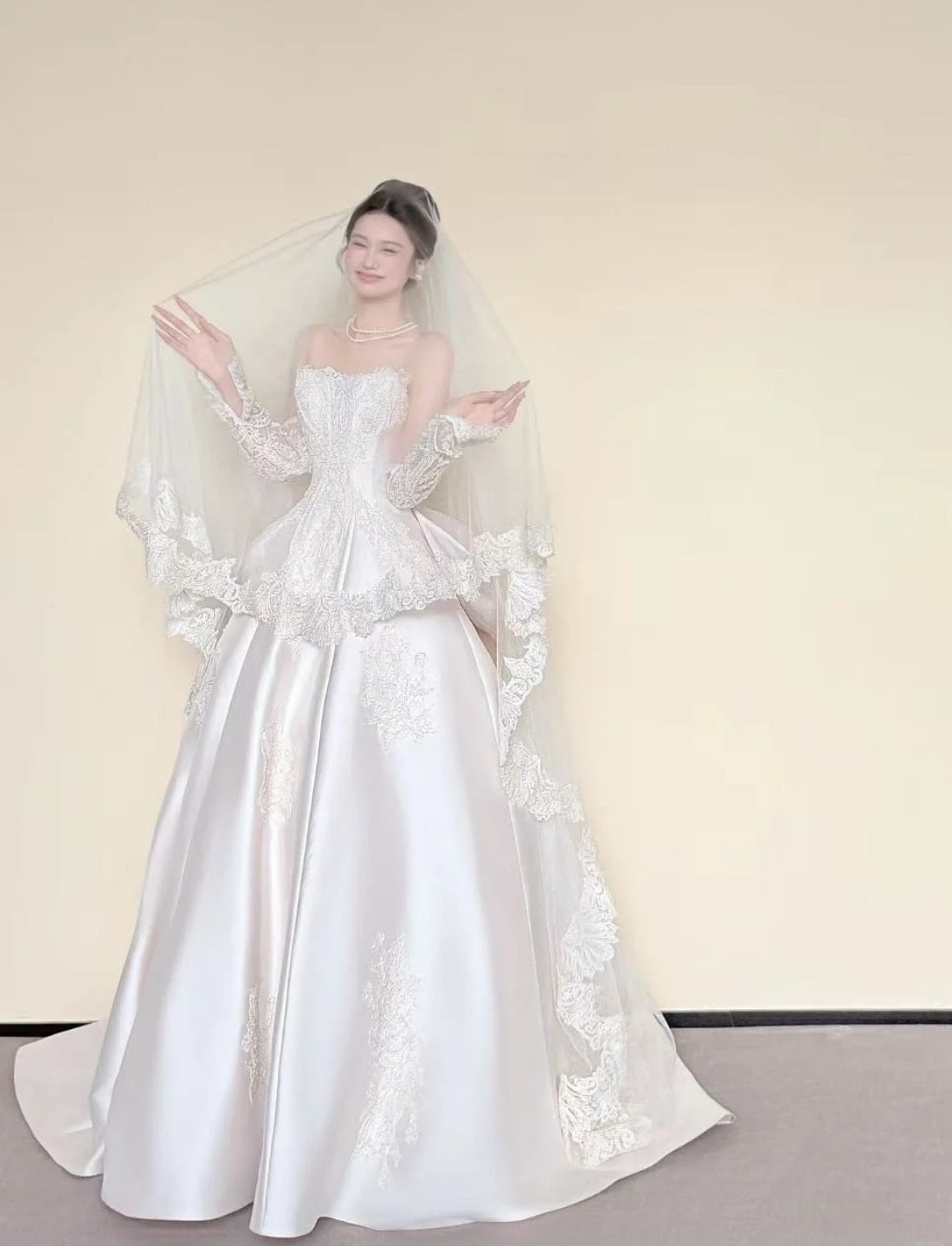 Chic Strapless A-Line Long Wedding Dresses Satin Appliques Bridal Gowns Sleeveless Bridal Dresses DP04315