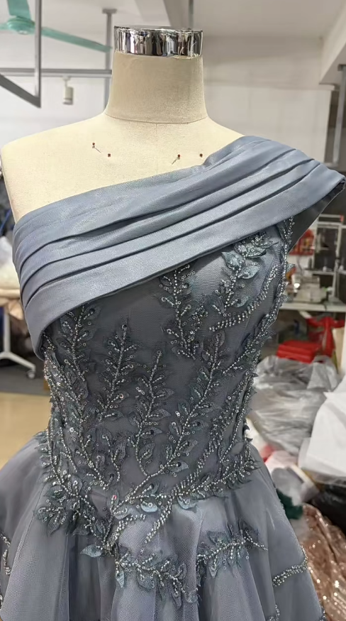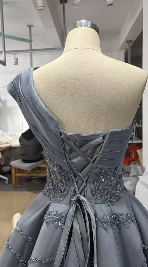Cute A-line Gray Long Prom Dresses Tulle One-shoulder Quinceanera Dresses Sleevs Sweet 16 Dresses DP04439