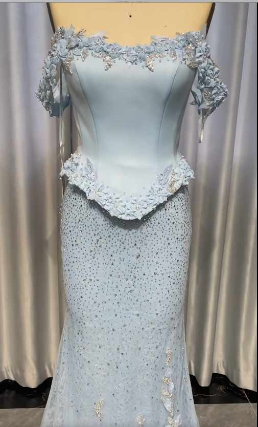 Gorgeous Mermaid Long Prom Dresses Tulle Applique Blue Evening Dresses Off-shoulder Birthday Dresses DP04678