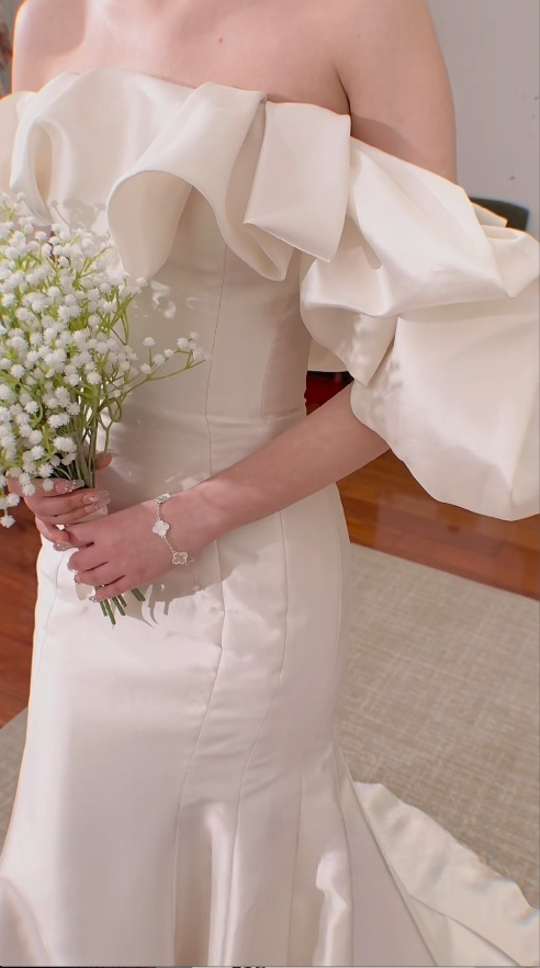 Simple Mermaid Long Wedding Dresses Satin Off-shoulder White Bridal Gowns Cups Sleeves Bridal Dresses DP04623
