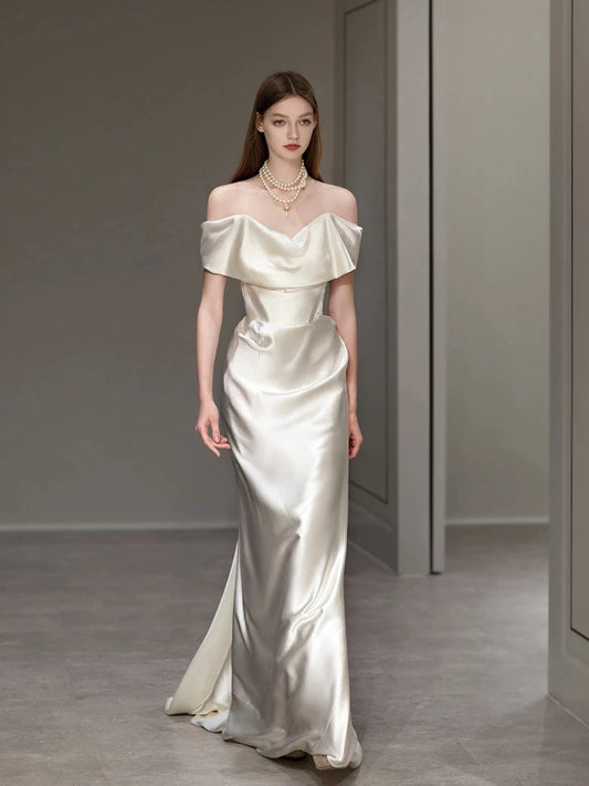 Robe de mariée élégante en satin à épaules dénudées et manches courtes, style sirène, H2868