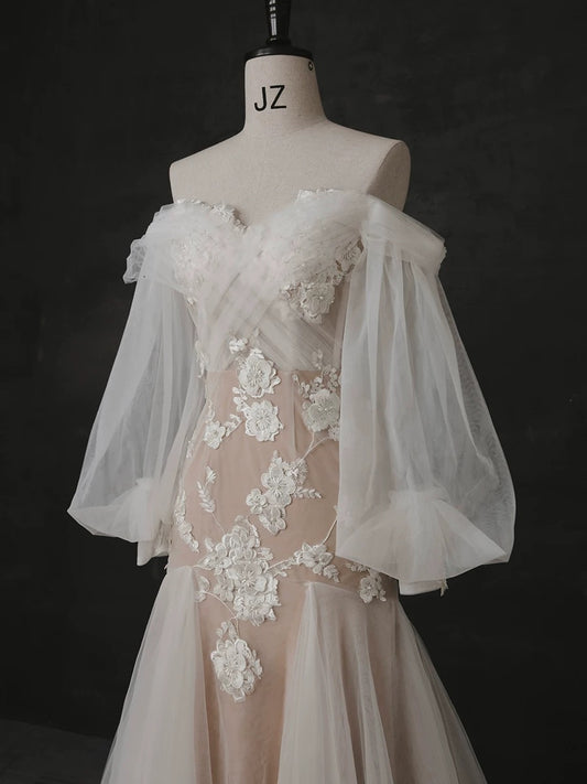 Robe de mariée élégante sirène à épaules dénudées et manches longues en dentelle blanche H2901